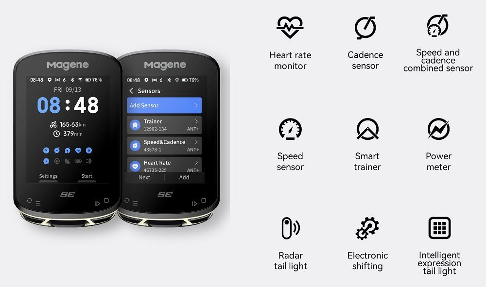 Avec les protocoles sans fil ANT+ et Bluetooth, le C506 SE se connecte à une grande variété de dispositifs, y compris des capteurs de vitesse, de cadence, des capteurs combinés, des moniteurs de fréquence cardiaque, des capteurs de puissance, des home trainers intelligents, des radars arrière, des feux arrière intelligents, et des systèmes de changement de vitesse électroniques SRAM eTap et Shimano Di2.
