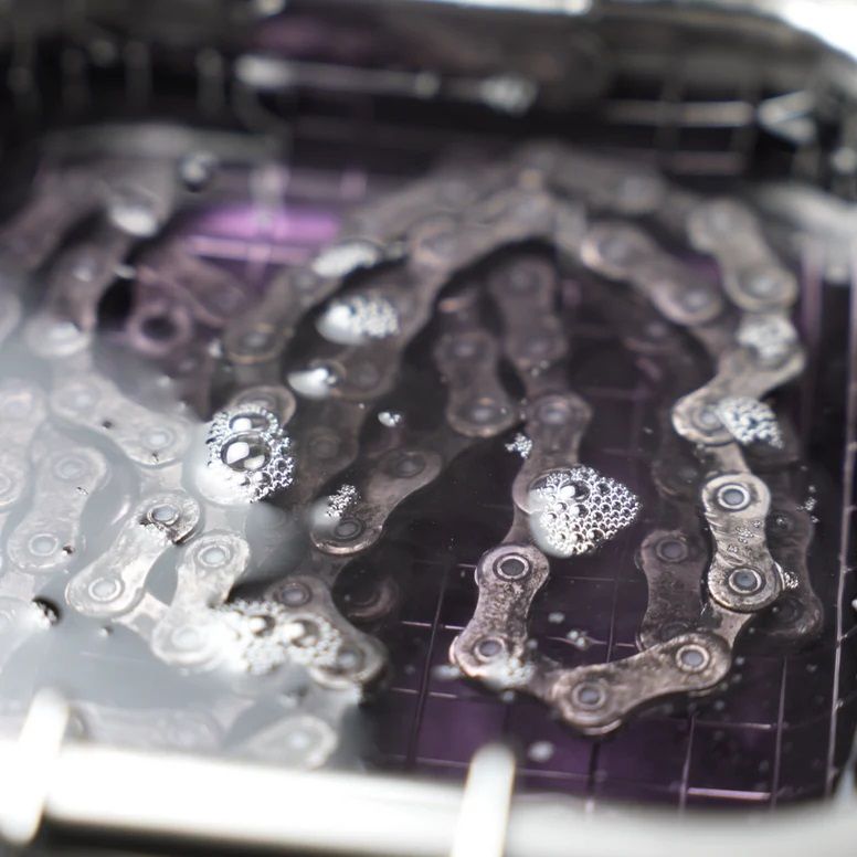 Striptease dissout les contaminants au contact, sans besoin de frotter vigoureusement. Il commence à agir en quelques secondes et peut nettoyer une chaîne entière en quelques minutes. Vous pouvez l'utiliser dans un nettoyeur à ultrasons pour un nettoyage encore plus profond.