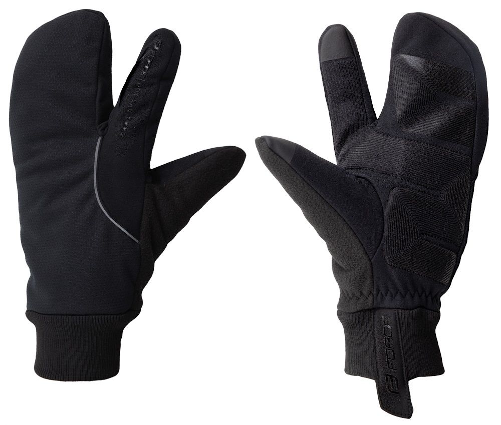 Gants Hiver Force HOT RAK 3 PROGants de cyclisme d'hiver (conviennent également à d'autres sports), unisexesExtra chauds, côté pouce en éponge douce pour s'essuyer le nez3+1 doigtsPaume et doigts antidérapantsÉléments réfléchissants, poignets élastiques allongésTempérature de confort : -5 °C à 0 °CComposition : 50 % polyester, 40 % nylon, 10 % élasthanne