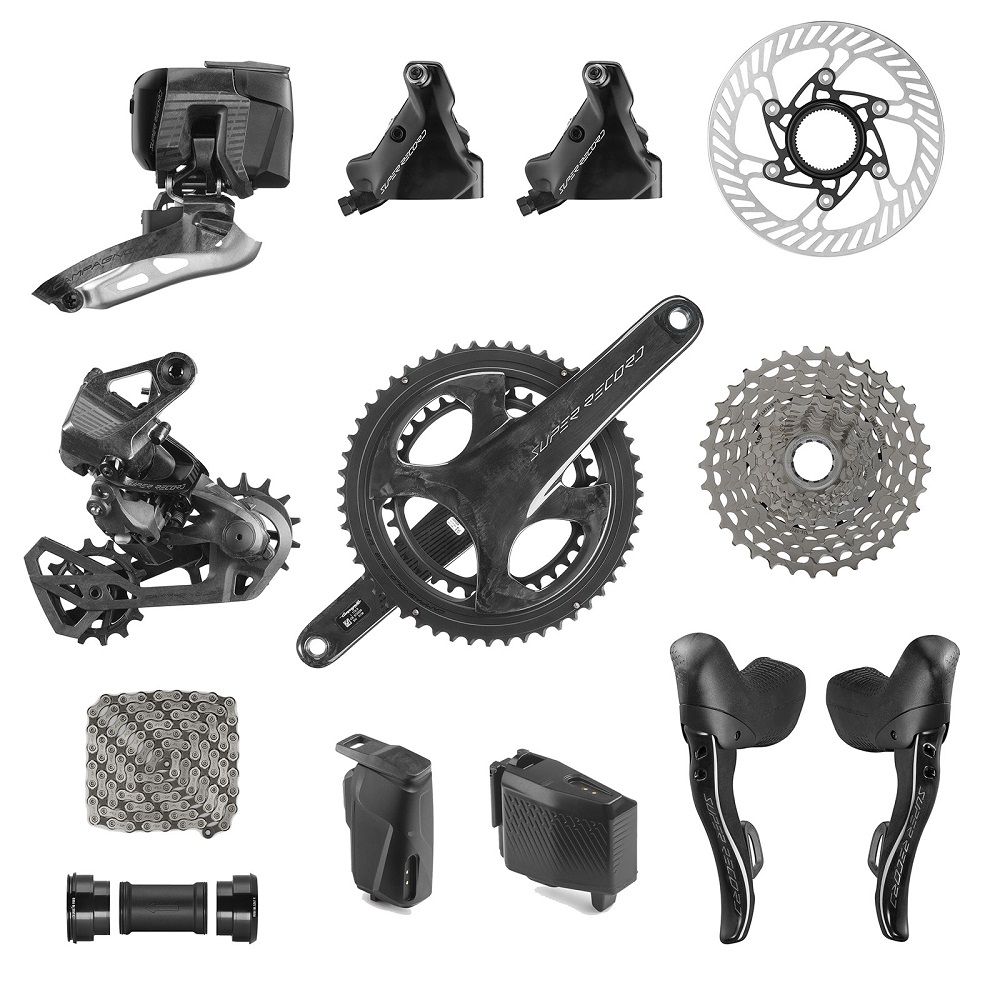 Le groupe comprend :Pédalier Super Record Ultra-Torque Carbon 13v - FC02-SR13 (au choix)Cuvettes BB86 Press-fit Quick-Tech 86.5x41 - IC02-QCKBB86 Levier Droit Super Record 13v - EP02-SR13RWRL Levier Gauche Super Record 13v - EP02-SR13LWRL Etrier Avant 160 Super Record 13v - CL02-DB160F Etrier Arrière 140 Super Record 13v - CL02-DB140 Dérailleur Arrière Super Record WRL 13v - RD02-SR13WRLDérailleur Avant Super Record WRL 13v - FD02-SR13WRL Lot de 2 Batteries Dérailleur Super Record 12/13v - PU02-SR13FDRD Cassette Super Record 13v - CS02-SR13 (au choix)Chaîne Super Record 13v - CN02-SR13MLDisques AFS Etoile Alu (1x 140 et 1x 160)