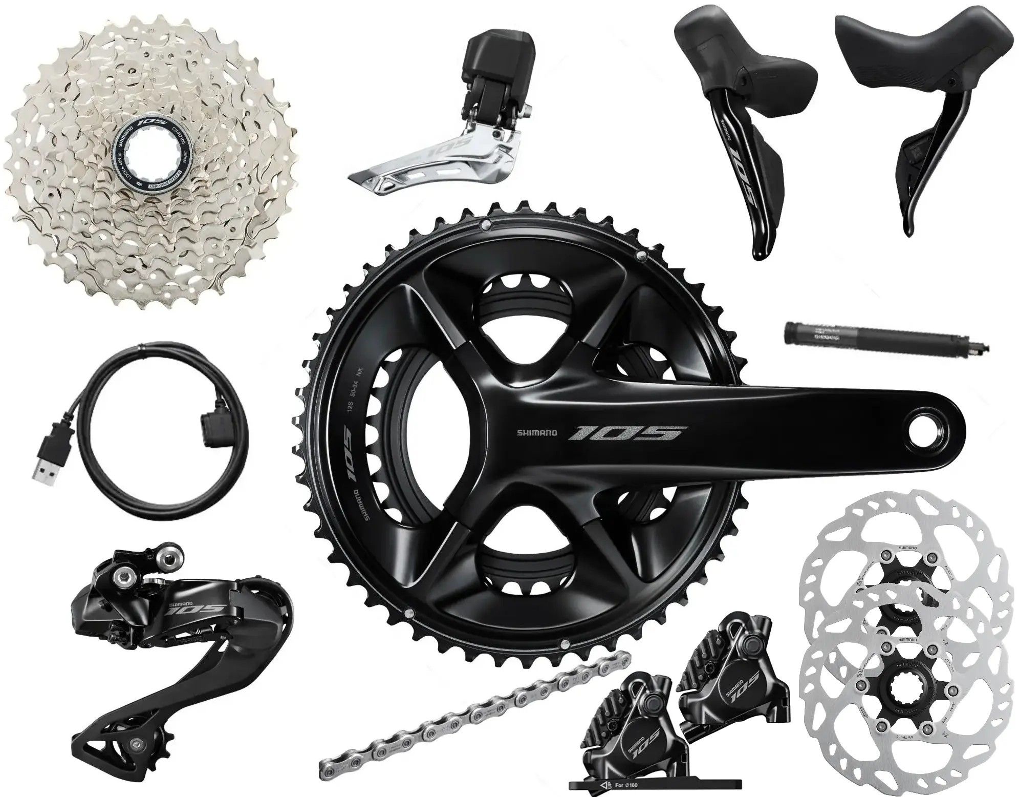 Le Groupe Shimano 105 R7170 Di2 12v comprend:Pedalier Shimano 105 R7100 12vCuvettes Shimano Ultegra BBR60 (nous contacter si vous souhaitez un autre modèle)Freins à Disques Route Shimano 105 Etriers BR-R7170 + Leviers Di2 ST-R7170 12vDisque SM-RT70 160mm (140mm sur demande)Dérailleur Avant Shimano 105 Di2 R7150 Electronique Brasé 12vDérailleur Arrière Shimano 105 Di2 R7150 Electronique 12vChaîne Shimano M7100 12v + Quick LinkCassette Shimano 105 R7101 - 12vCablerie Electrique Shimano Di2 - EW-SD300Batterie Shimano Di2 BT-DN300 en 12v pour Tige de SelleCâble Chargeur 1700mm Shimano EW-EC300