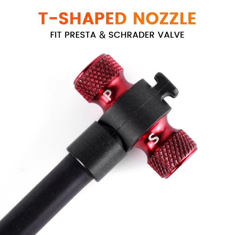 3. Conception de buse innovante en forme de T : équipée d'une buse polyvalente en forme de T sur le tuyau, elle bascule sans effort entre les valves Schrader (américaines) et Presta (françaises) , offrant une commodité ultime.