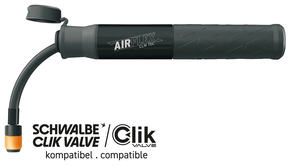 Pompe à vélo pour le système CLIK VALVEL’AIRFLEX EXPLORER CLIK TEC impressionne avec sa technologie de vannes ultra-moderne et son design stylé. Un flexible extensible avec tête de pompe CLIK TEC se cache à l’intérieur de la mini-pompe et est parfaitement adapté au système Schwalbe Clik Valve. La tête de valve innovante garantit une utilisation intuitive à deux doigts et empêche les pertes de pression lors du retrait. Le débit volumique est d’environ 50 % supérieur aux valves Presta classiques.